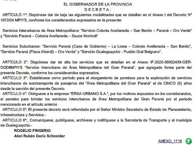 El decreto ahora dejado sin efecto había establecido la baja de diversos servicios interurbanos y suburbanos, entre ellos los recorridos Colonia Avellaneda–San Benito–Paraná–Oro Verde, Paraná–Colonia Avellaneda–Sauce Montrull y Gualeguaychú–Pueblo General Belgrano, además de disponer la creación del denominado “Servicio Interurbano del Área Metropolitana del Gran Paraná”, otorgando permisos por cinco años a la firma ERSA Urbano S.A.