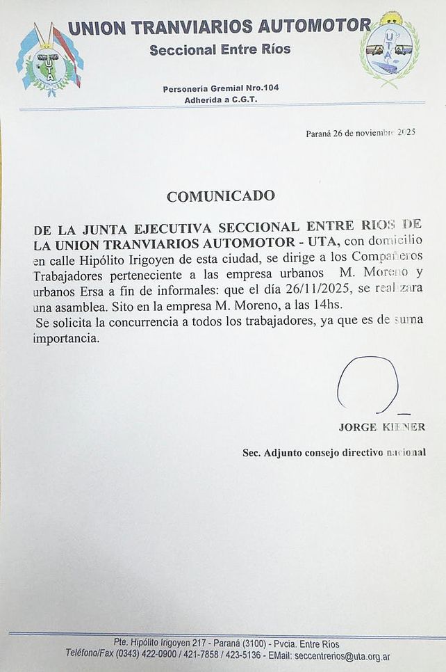 Desde las 14 no circularán los colectivos urbanos de Paraná por una nueva asamblea de choferes nucleados en la Unión Tranviarios Automotor (UTA) en el marco del coflicto sostenido con la nueva empresa concesionaria respecto a la continuidad laboral de los trabajadores.