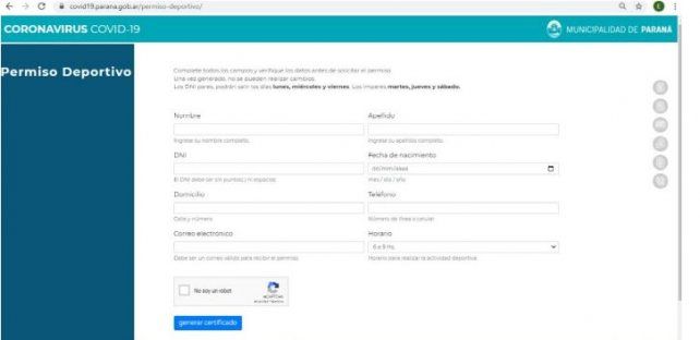 Ingresar al micrositio covid19.parana.gob.ar y buscar el botón verde con el nombre PERMISO DEPORTIVO ubicado en el centro de la web.