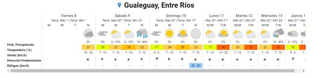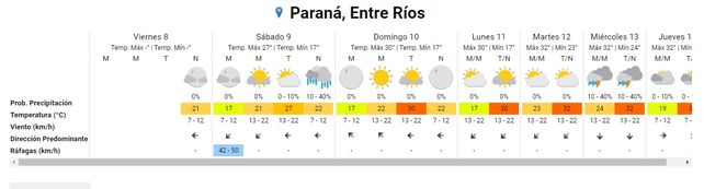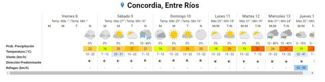 Las precipitaciones no permanecerían el domingo, que tendría cielo despejado por la mañana y algo nublado hacia la tarde y la noche. El pronóstico anuncia estas condiciones para todo Entre Ríos. La temperatura sería calurosa pero agradable, entre 22° y 30°.