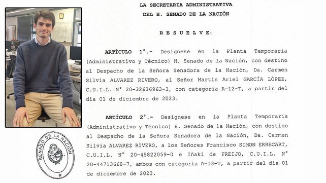 Desde diciembre de 2023 el CEO de Humming Airways SRL Francisco Simón Errecart revistaba en la categoría A-13-T del Senado de la Nación como empleado de la senadora por la provincia de Córdoba Carmen Silvia Álvarez Rivero, del PRO.
