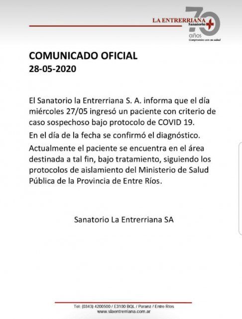"Corresponde a un adulto mayor oriundo del departamento Paraná, quien se encuentra internado en un efector privado con antecedentes de factores de riesgo, permanece estable y se está investigando el nexo epidemiológico", señala el reporte. En paralelo, el Sanatorio La Entrerriana informó que tiene un paciente confirmado de Covid19, que sería el caso consignado por Salud de la provincia.