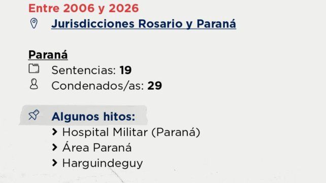 En el caso de Entre Ríos, el informe detalla que hay 29 condenados: 23 en la Justicia Federal de Paraná y 2 por la de Concepción del Uruguay. Las causas más relevantes fueron Hospital Militar, Área Paraná y Harguindeguy, reconstruye UNO.