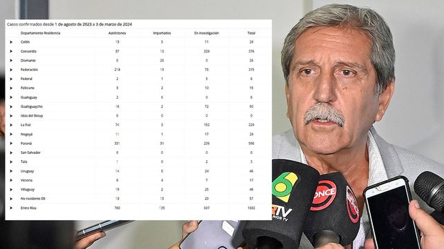 En el monitor de casos de dengue, se refleja que en el período comprendido entre el 1 de agosto de 2023 y el 3 de marzo de 2024, la provincia de Entre Ríos registra un total acumulado de 1.892 casos. De ellos, 760 son autóctonos; 135 corresponden a la categoría de importados y 997 se encuentran en investigación (se trata de casos confirmados, pero que aún falta determinar si corresponden a autóctonos o importados).