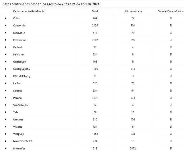 En el monitor de casos de dengue se puede consultar la información actualizada con los datos correspondientes a la semana epidemiológica 16. Allí se detalla que en los últimos siete días los departamentos que reportaron mayor cantidad de casos fueron Gualeguaychú (513), Paraná (375), Concordia (301) y Federación (299).