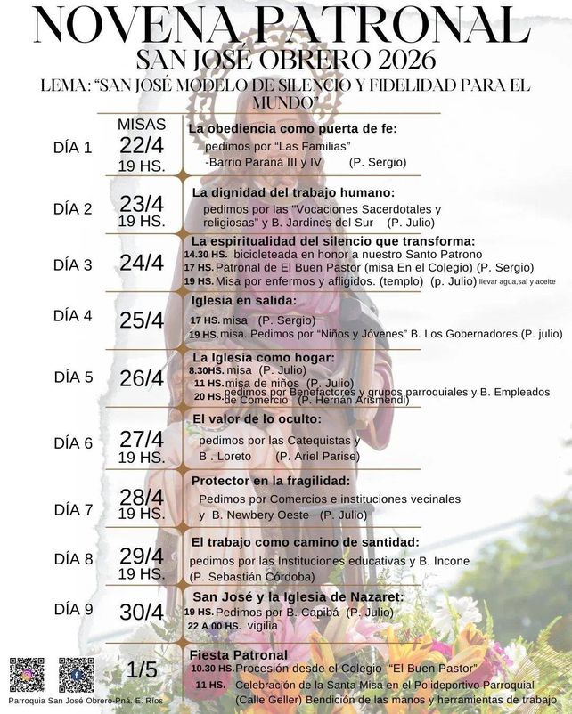 Cada 1º de mayo la Iglesia Católica celebra la Fiesta de San José Obrero, patrono de los trabajadores. En la iglesia que lleva su nombre en Paraná, se desarrollará la Santa Misa. Previo a la celebración, se realizará una procesión desde el colegio El Buen Pastor hasta el polideportivo parroquial. El lema de este año será San José modelo de silencio y fidelidad para el mundo.
