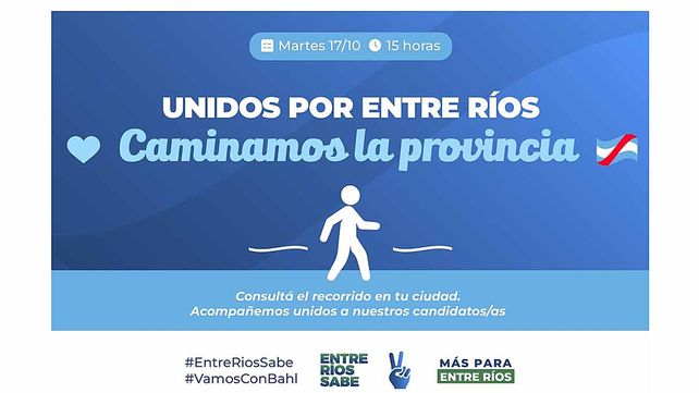 En el Día de la Lealtad, y a pocos días de las elecciones, el peronismo entrerriano de la lista “Más por Entre Ríos”, que lleva como candidato a gobernador a Adán Bahl, realizará este martes por la tarde caminatas en distintas localidades de la provincia, de manera simultánea bajo la consigna “Unidos por Entre Ríos caminamos la provincia”.