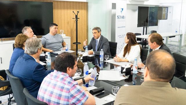 Guillermo Michel, Gustavo Bordet, Blanca Osuna, Marianela Marclay y Adán Bahl mantuvieron un encuentro este miércoles con los referentes sindicales Jorge Sola (Seguro), Cristian Jerónimo (Vidrio), Carlos Molinari (Carne) y Pablo Flores (AEFIP) para abordar la reforma laboral y la problemática de los trabajadores del citrus y del sector avícola de la provincia.
