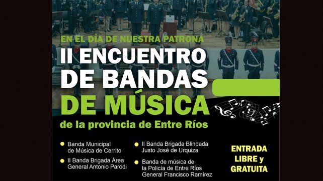 Luego, desde las 18 será la actuación de las bandas. "Invitamos a toda la comunidad a vivir una tarde noche llena de ritmo, melodías y emociones en el 2° encuentro de bandas de música de Entre Ríos", dijo.