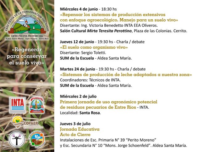 La comunidad de Aldea Santa María (departamento Paraná) se alista para celebrar la 32ª edición de la Fiesta de la Conservación del Suelo (27° fiesta provincial). Si bien tanto en junio como parte de julio habrá charlas sobre diferentes temáticas y jornadas educativas, la celebración central con concurrencia de escuelas primarias y secundarias de la zona está prevista para el jueves 3 de julio en las instalaciones de la escuela primaria N° 39 Perito Moreno y secundaria N° 10 Monseñor Jorge Schoenfeld. La actividad, un pilar para la región, busca concientizar y capacitar sobre la importancia de mantener la vitalidad del suelo, según explicó Claudio Hergenreder, presidente de la comisión organizadora.