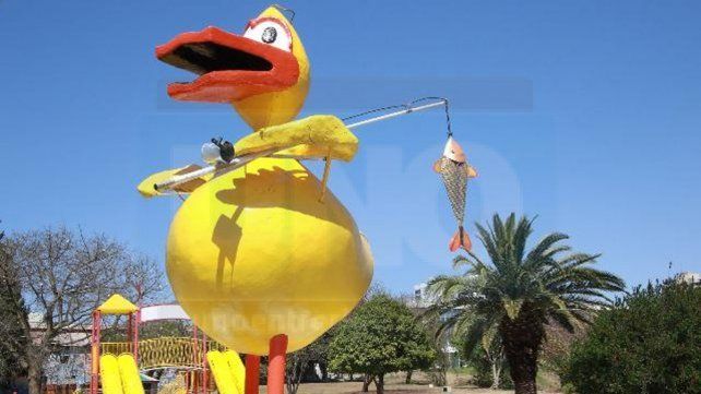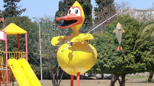 El Patito Sirirí, ubicado en el parque infantil de calle Gregoria Matorras al final, en Paraná, recuperó este viernes uno de sus detalles históricos: la caña de pescar con un pescado enganchado.