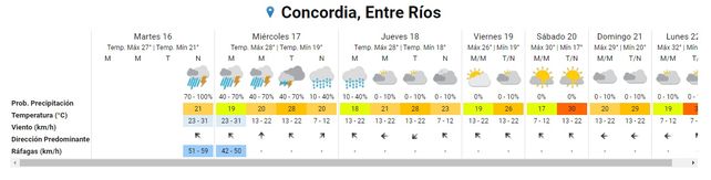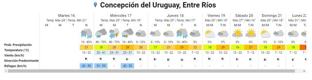 El SMN extendió el alerta "amarillo" por tormentas desde la noche de este martes hasta el mediodía de este miércoles para los departamentos Concordia, Federación, Federal, Feliciano y San Salvador, a los que se suman con el mismo pronóstico durante la mañana de este miércoles Colón, Gualeguaychú, Islas, Tala y Uruguay.