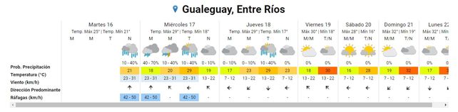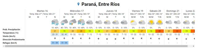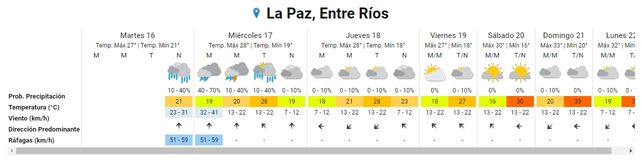 Para este miércoles el Servicio Meteorológico anuncia en toda la provincia de Entre Ríos precipitaciones durante toda la jornada, hasta la noche, cuando el cielo retornaría a mayormente nublado. El descenso de temperatura registrado este martes se extenderá durante el miércoles, con mínimas en torno a los 19° y máximas no superiores a 28°, provocadas por la persistencia del viento sur en toda la provincia.
