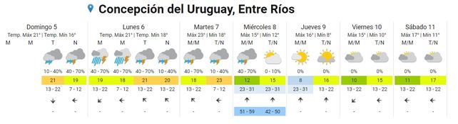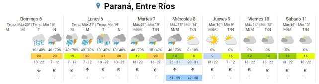 Luego, el miércoles continuarían las tormentas aisladas durante buena parte de la jornada, aunque hacia la tarde el cielo retornaría a parcialmente nublado. Para la mitad de la semana se anuncian registros térmicos de entre 14° y 18°.