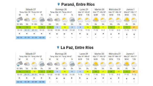 Para el caso de Paraná, el pronóstico del SMN indica para la noche de este viernes una temperatura de 18°, con viento del sureste de entre 13 y 22 kilómetros por hora. Para el sábado se esperan algunas lluvias aisladas durante la madrugada y luego cielo mayormente o parcialmente nublado, sin lluvia. La temperatura mínima del día será de 12° y la máxima de 18°. El viento seguirá siendo del sureste, con ráfagas de entre 51 y 59 kilómetros por hora.