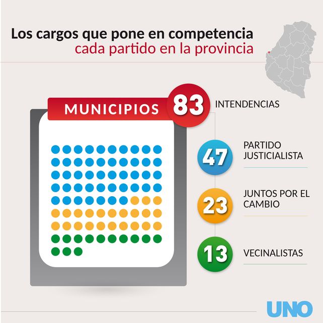 Son 83 municipios distribuidos en 17 departamentos. Todas sus intendencias se votarán primero el 13 de agosto, en las Primarias, Abiertas, Simultáneas y Obligatorias (PASO), y los candidatos que resulten de este primer comicio competirán en las generales del 22 de octubre. El Partido Justicialista someterá a reválida sus gestiones en 47 ciudades, en todos los casos bajo la boleta provincial que tendrá como candidato a gobernador a Adán Bahl y el cuerpo nacional de ese papel que mostrará a Gustavo Bordet postulado para diputado nacional.