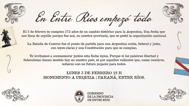 El 3 de febrero es feriado provincial en Entre Ríos e conmemoración a la Batalla de Caseros.