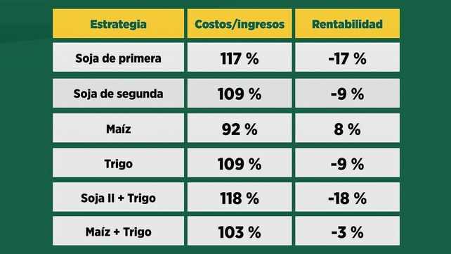 Los rendimientos históricos varían según el grano: 2.380 kilogramos por hectárea es el de la soja de primera, 1.980 el de soja de segunda, el promedio del trigo se ubica en 2.840 kilos, y el del maíz en 5.930 kilogramos por hectárea. Para esta temporada, únicamente el maíz lograría una rentabilidad positiva del 8%, mientras que el resto tendrá que superar los rendimientos promedios registrados para cubrir los costos.