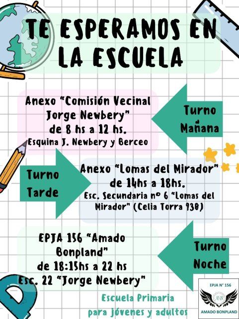 - Sede principal de la 156: Escuela N° 22 Jorge Newbery, ubicada sobre Newbery al 2985. Horario de 18 a 22.