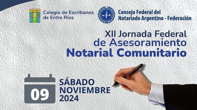 La XII Jornada Federal de Asesoramiento Notarial Comunitario será el sábado 9 de noviembre. Faltan dos semanas para esta actividad, que se llevará adelante en simultáneo en todo el país, y en la que participará el Colegio de Escribanos de Entre Ríos –que nuclea a unos 430 escribanos, entre titulares y adscriptos–, brindando asesoramiento gratuito en diversas localidades.