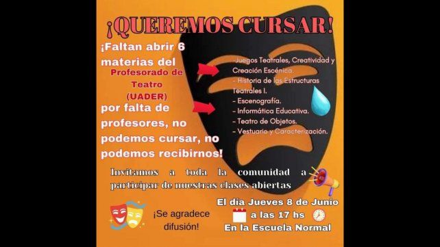 Este jueves a las 17, en la Escuela Normal, estudiantes del Profesorado de Teatro que se dicta en la Universidad Autónoma de Entre Ríos (Uader), convocan a la comunidad a participar de clases abiertas para reclamar por el dictado de seis materias que no se dictan hace más de un año.