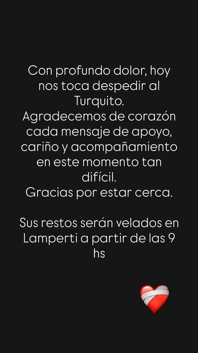 "Con profundo dolor, hoy nos toca despedir al Turquito", comienza el posteo difundido a través de las historias de Instagram. En el mismo, la familia y el equipo de trabajo agradecieron el acompañamiento recibido: "Agradecemos de corazón cada mensaje de apoyo, cariño y acompañamiento en este momento tan difícil. Gracias por estar cerca", manifestaron.