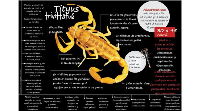 Las especies halladas corresponden a Tityus trivittatus, considerada de alta peligrosidad. Estos arácnidos suelen aparecer con mayor frecuencia durante la noche y en jornadas de altas temperaturas.