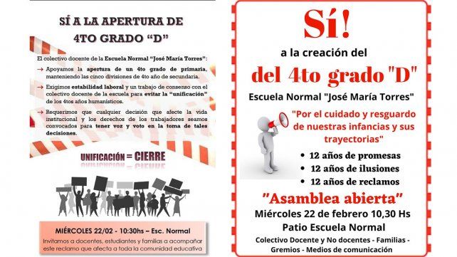Padres y docentes de la Escuela Normal 'José María Torres' de Paraná se reunirán en asamblea abierta este miércoles 22 desde las 10.30 para pedir por la apertura de la división "D" del 4° grado de la institución, cuya apertura se suspendió a una semana del inicio de clases. Asimismo, pedirán por la no unificación de dos divisiones de Orientaciones Humanísticas de 4° del nivel secundario.
