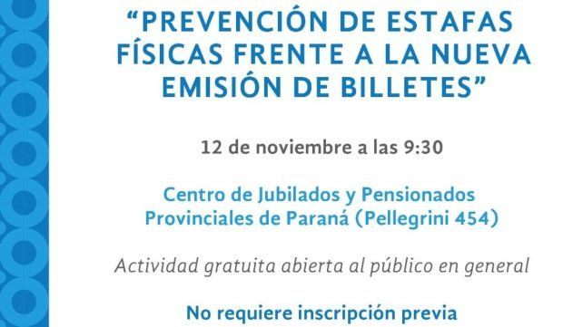 El Centro de Jubilados y Pensionados Provinciales del Departamento Paraná invita el 12 de noviembre, a las 9.30, a la comunidad a una charla pensada para prevenir estafas físicas frente a la nueva emisión de billetes. Es una actividad organizada en forma conjunta con la facultad de Ciencia y Tecnología de la Universidad Autónoma de Entre Ríos (Uader) y la Defensoría del Pueblo de Paraná.