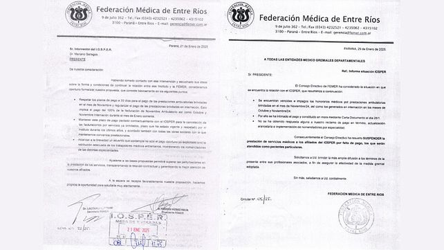 En una nota dirigida a todas las entidades médico gremiales departamentales, el Consejo Directivo de la Femer comunicaba que había honorarios médicos post prestaciones ambulatorias brindadas en el mes de noviembre del 2024 "vencidos e impagos". También los generados en internación en octubre y noviembre. Además, recordaron que Iosper fue intimado a realizar el pago con una Carta Documento el día 28 de enero, sin haber tenido respuesta alguna.