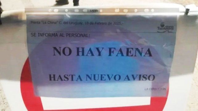 Trabajadores de Granja Tres Arroyos llegaron hasta la planta La China de Concepción del Uruguay y se encontraron con un cartel que dice que, “hasta nuevo aviso”, no habrá faena.