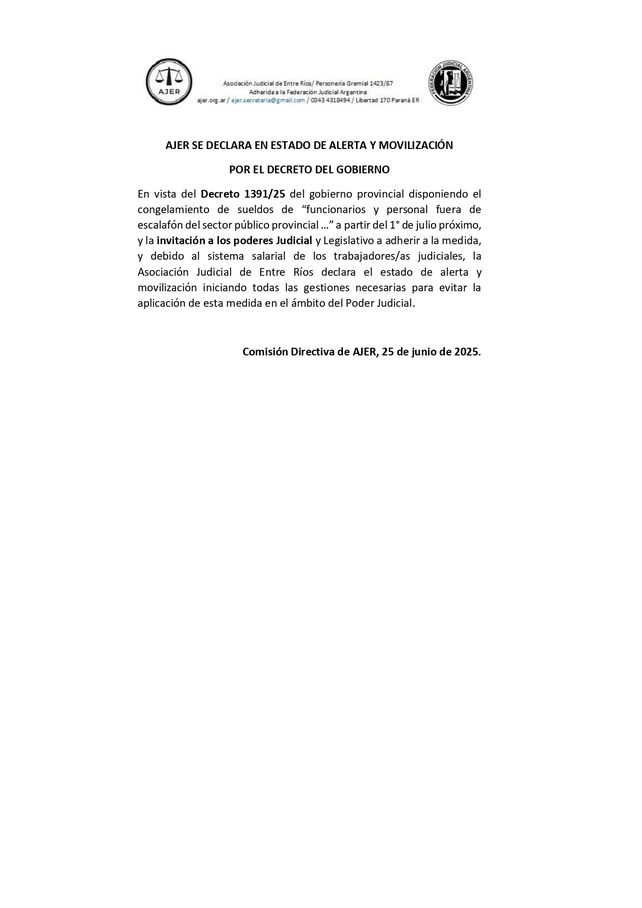 El decreto también incluye una invitación a los poderes Judicial y Legislativo a adherir a la medida. Ante esta situación, y debido al sistema salarial de los trabajadores y trabajadoras judiciales, AJER informó que iniciará todas las gestiones necesarias para evitar la aplicación de esta medida en el ámbito del Poder Judicial.