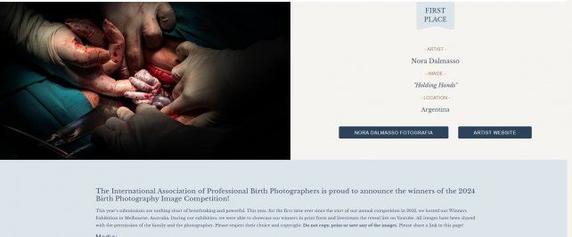"Este año, los ganadores fueron revelados en una exposición realizada en Melbourne, Australia. Durante la exhibición, las imágenes premiadas se presentaron en formato impreso y se transmitió en vivo a través de YouTube. Nora Dalmasso, con su obra excepcional, se destacó como la ganadora en la categoría Delivery y primer premio del certamen con la imagen “Holding Hands” (Manos enlazadas). La fotografía de Nora no solo celebra la belleza del nacimiento, sino también la dedicación y empatía que ella muestra hacia las madres y los profesionales de la salud en cada momento crucial. Capturar el nacimiento de un bebé es un regalo invaluable tanto para las familias como para los fotógrafos, y Nora lo hace con una sensibilidad y sutileza incomparables", finalizaron.