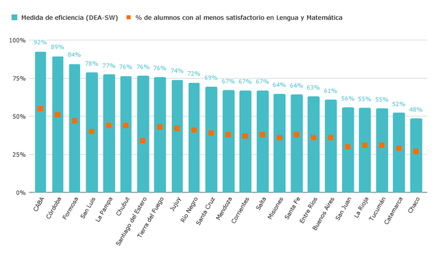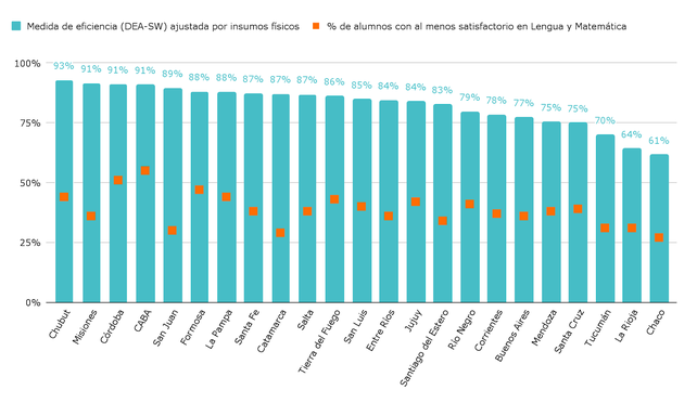 En este sentido, además, en lo referente a la eficiencia de los recursos físicos respecto al porcentaje de alumnos con desempeño al menos satisfactorio en Lengua y Matemática, la provincia mide un 84%. El informe explica: “Con estos insumos, varias provincias se acercan a un uso casi óptimo de sus recursos para alcanzar aprendizajes satisfactorios, lo cual sería alentador si el promedio nacional de dichos aprendizajes no continuara siendo preocupantemente bajo”. Se añade: “Si bien se observa una relación positiva entre el esfuerzo presupuestario por alumno de cada provincia y los resultados educativos en primaria, esta asociación no es directa pues otros factores como la gestión educativa, el contexto socioeconómico y las políticas implementadas también influyen en los resultados y en cómo se realiza el esfuerzo”.