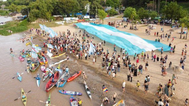 El momento más emotivo de la jornada, fue el despliegue de una enorme bandera argentina al momento de la llegada de la travesía, y momento en que a viva voz los presentes reafirmaron "El río no se vende"