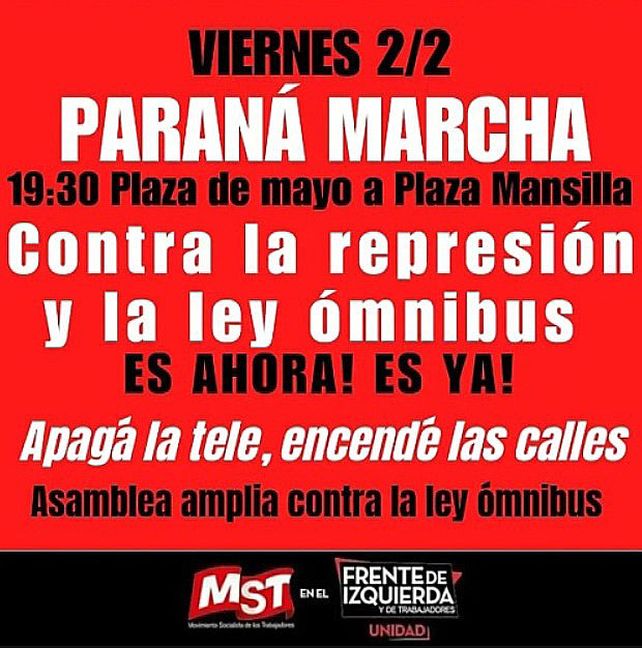 La convocatoria MST en el FIT reza: “No te quedes calladx, tomemos las calles para gritar bien fuerte contra la represión y contra la ley ómnibus: NO PASARÁN”. Convocan a movilizarse este viernes 2 de febrero "contra la Ley Ómnibus y la brutal represión de las fuerzas de seguridad contra los manifestantes que protestaban en las inmediaciones del Palacio Legislativo, disparando balas de goma y repartiendo palos y gases".