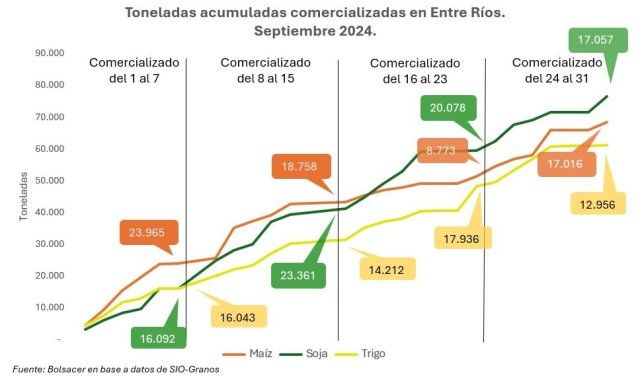 Unas 68.513 toneladas de maíz, otras 76.588 toneladas de soja y 61.148 toneladas de trigo fueron vendidas oficialmente durante el mes de septiembre en Entre Ríos, detalló la Bolsa de Cereales, y explicó que los productores registraron un comercio "regular" del trigo a lo largo del mes, mientras que la soja y el maíz presentaron mayores variaciones intersemanales.