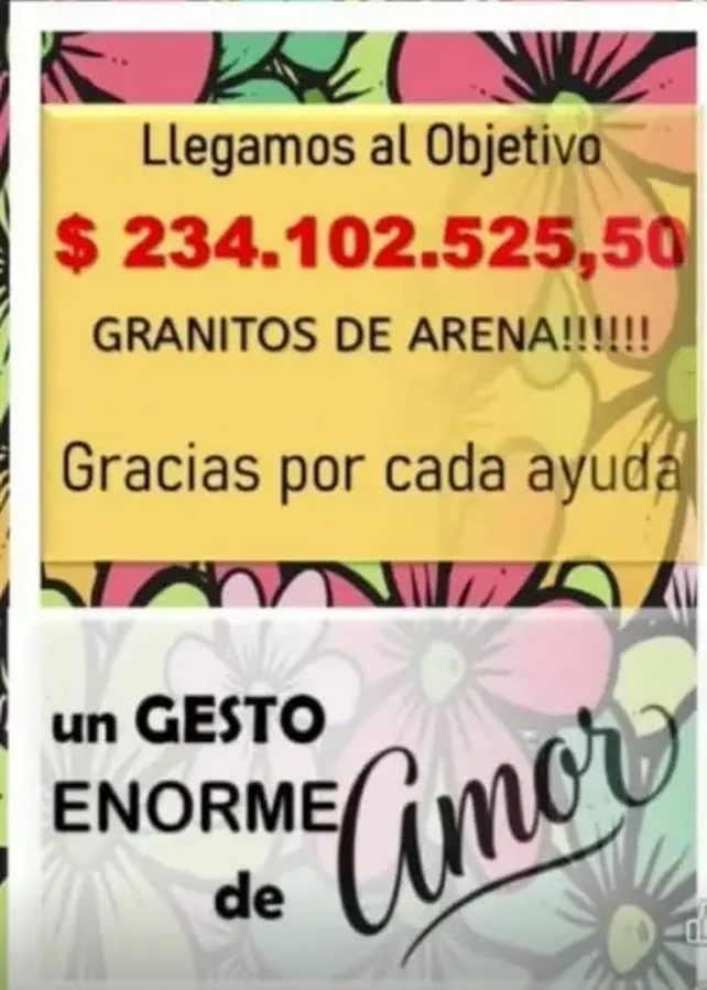 Gracias a la solidaridad de la comunidad, se logró reunir exactamente $234.102.525,50. En un flyer difundido por sus allegados, los familiares expresaron su profundo agradecimiento: "Llegamos al objetivo. Gracias por cada ayuda. Un gesto enorme de amor", destacando la importancia de cada "granito de arena" aportado.