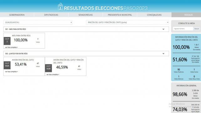 En la Junta de Gobierno Rincón del Gato, en el departamento Gualeguaychú, se presentaron dos listas, una por el frente Más para Entre Ríos y otra por Juntos por el Cambio. Esta última tuvo internas: una propuesta sacó 47 votos y la otra 41. En tanto, la lista del peronismo sólo cosechó 7 votos. Lo llamativo es que la lista que se presentó en las PASO está integrada por ocho personas. La encabezó Abel Preisz, quien estuvo acompañado por otros cuatro vocales titulares y tres suplentes.