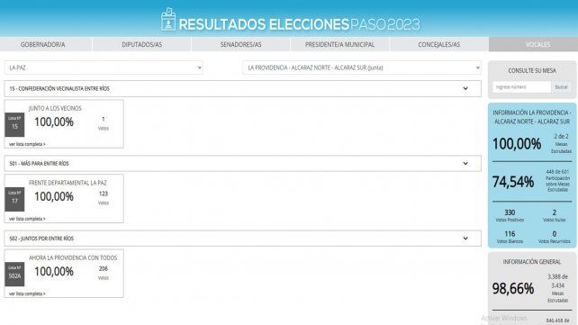 En cambio, la lista N° 17 "Frente departamental La Paz", de Más para Entre Ríos, sacó 123 votos; y la N° 502 A "Ahora La Providencia con Todos", de Juntos por Entre Ríos, obtuvo 206 voluntades.