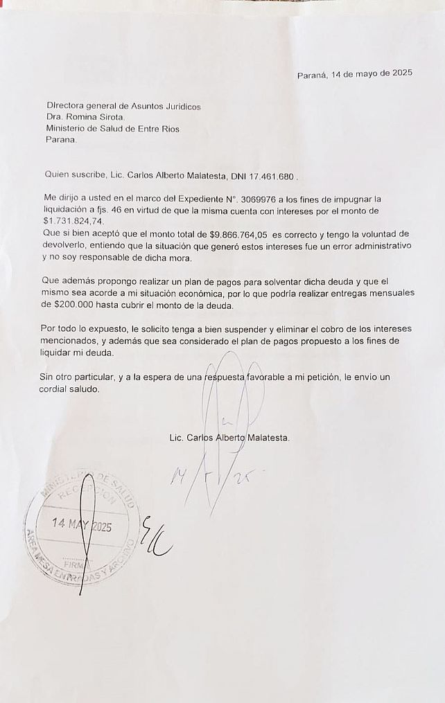 El escrito fue presentado el 14 de mayo de 2025, en el marco del expediente administrativo iniciado tras detectarse que el profesional continuó cobrando el adicional por Responsabilidad Funcional luego de su renuncia al cargo, ocurrida el 2 de julio de 2024. En su descargo, Malatesta admitió la validez del monto reclamado, aunque cuestionó la aplicación de intereses y adjudicó la situación a un “error administrativo”.