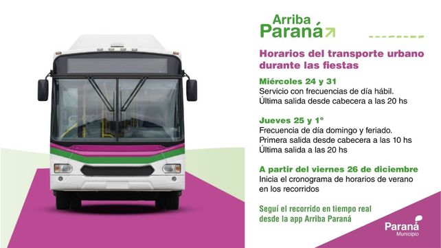 La Municipalidad de Paraná informó cómo funcionará el servicio de transporte urbano de pasajeros durante los días 24, 25 y 31 de diciembre y 1º de enero, y recordó que a partir de este viernes 26, comienzan a regir los horarios de verano.