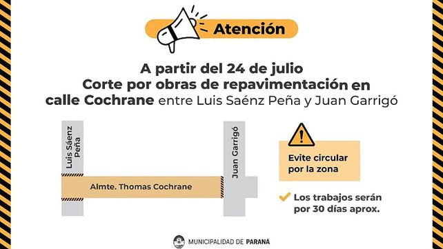 Desde este lunes 24 y por 30 días habrá restricciones en el tránsito y desvíos de recorridos del transporte urbano, por obras de recuperación de la trama vial en calle Cochrane, en el tramo que abarca desde Luis Saénz Peña hasta Garrigó. También se modificará el recorrido de la Línea 9 del transporte urbano, solo por este lunes, por obras en calle General Espejo, se indicó desde la Municipalidad de Paraná.