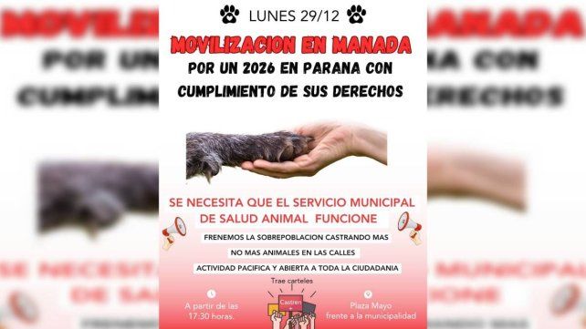 La consigna de la movilización de este lunes reza “por un 2026 en Paraná con cumplimiento de sus derechos” y reclama: “se necesita que el servicio municipal de salud animal funcione”.