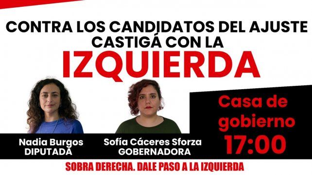 El MST-Nueva Izquierda y el Partido Obrero llevarán sus banderas y batucadas a la plaza Mansilla para cerrar su campaña provincial para las PASO frente a la Casa Gris. Será este jueves desde las 17. El FIT-Unidad postula a la docente universitaria Sofía Cáceres Sforza para gobernadora bajo la fórmula presidencial de los porteños Gabriel Solano (PO) y Vilma Ripoll (MST).