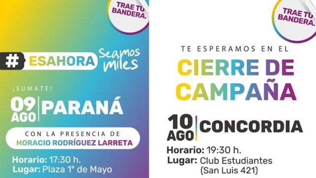 Con las Primarias, Abiertas, Simultáneas y Obligatorias (PASO) del domingo próximo en cuenta regresiva, cada alianza electoral prepara sus cierres de campaña en Entre Ríos con distintas modalidades. Entre este miércoles y jueves habrá desde grandes actos masivos con presencias de importantes dirigentes de la política nacional hasta encuentros virtuales sin público, con los que cada precandidato a la gobernación dará su último mensaje antes de la veda electoral, que comienza el viernes a las 8 de la mañana.