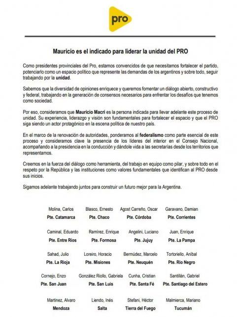 El texto lleva las firmas, entre otros, de los presidentes del PRO de la mayoría de las provincias, entre los cuales se cuentan a Eduardo Caminal (Entre Ríos), Carlos Molina (Catamarca), Ernesto Blasco (Chaco), Oscar Agost Carreño (Córdoba), Damián Garavano (Corrientes), Luciano Angelini (Jujuy) y Enzo Cornejo (San Juan).
