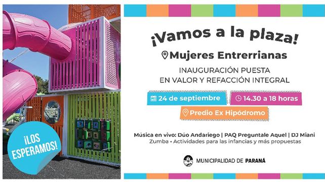 La renovada plaza Mujeres Entrerrianas quedará habilitada este domingo con propuestas para grandes y chicos. Las actividades comenzarán a las 14.30 con actividades para las infancias, zumba, música en vivo con Dúo Andariego, PAQ Preguntale Aquel, DJ Miani entre otros atractivos.