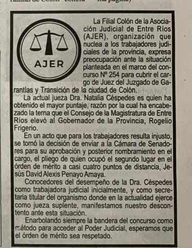 En otras palabras: el Ejecutivo hizo uso de una facultad discrecional que la ley le confiere, gracias a la cual puede optar sin atarse a un orden de mérito. Ante esta situación, desde la Asociación Judicial de Entre Ríos (AJER), seccional Colón, emitieron una nota pública dirigida a Frigerio y a los senadores.