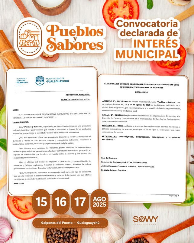 “Pueblos y Sabores”, organizado por Sowy Producciones, ha sido declarado de Interés Municipal por el Honorable Concejo Deliberante de la Municipalidad de San José de Gualeguaychú, en reconocimiento a su valioso aporte a la promoción de la identidad regional, el desarrollo productivo y el impulso turístico local.